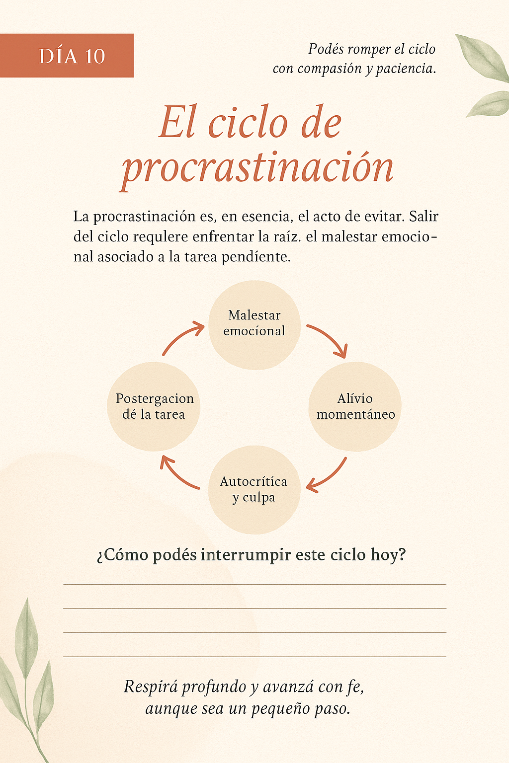 Este workbook de 21 días es tu guía práctica y espiritual para transformar la procrastinación en acción consciente y enfocada.